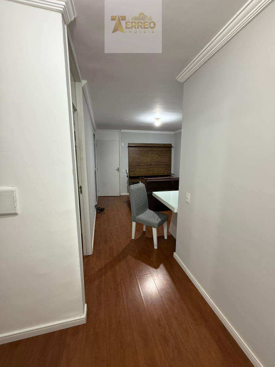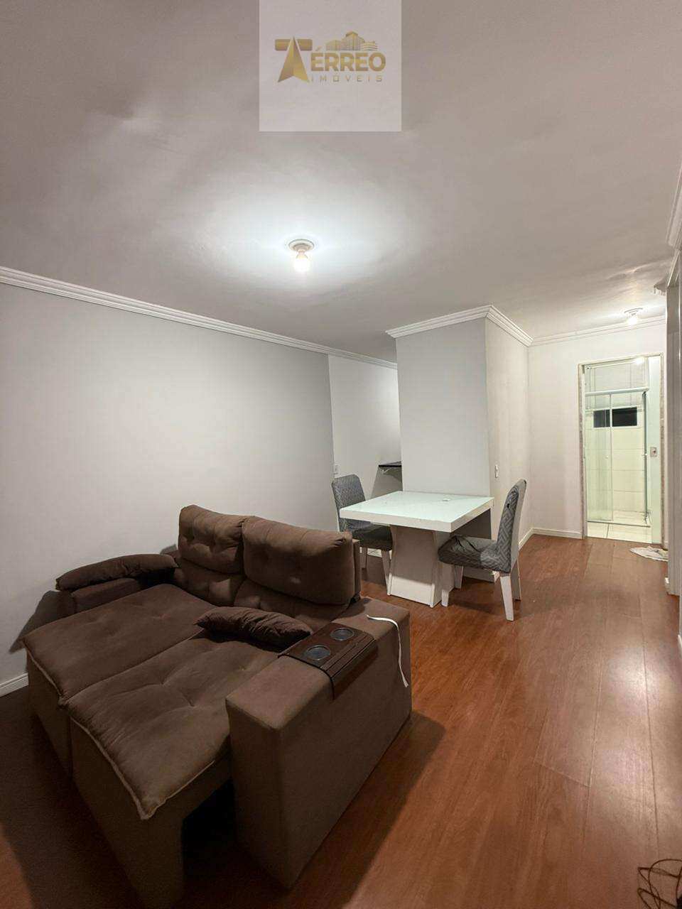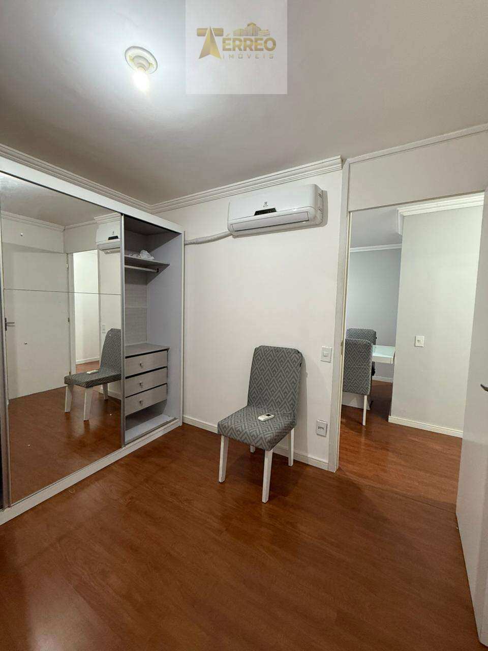 ?com pisos laminado, todo pintado, móveis planejados na cozinha (cooktop, forno elétrico, sugar), móvel no banheiro, quarto com guarda roupa casal, ar split, persiana romana, outro quarto com ar de caixa, sala com mesa, sofá e painel de tv.