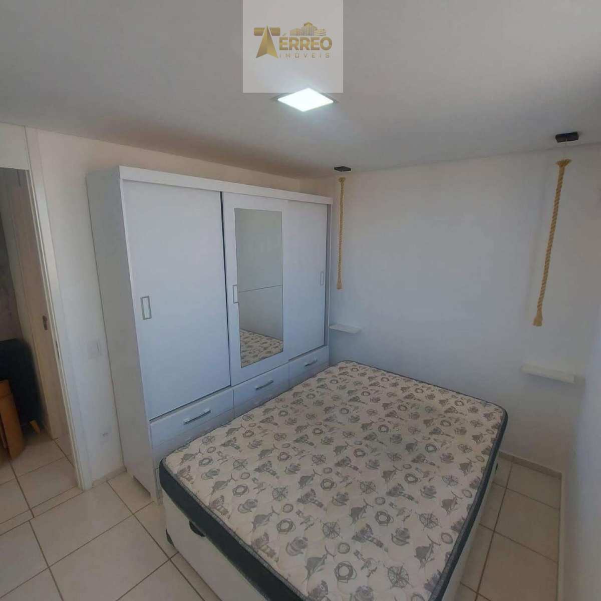 Apartamento com armários na cozinha e banheiro, Além de guarda roupa em um dos quartos. O apartamento está todo pintado com rebaixamento em gesso e luminárias.